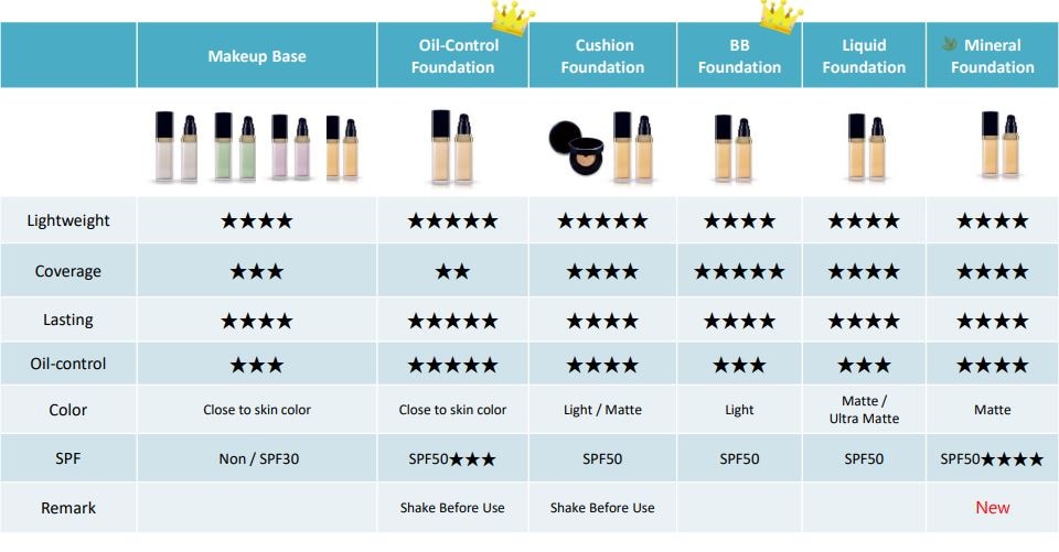 - Liquid foundation - With SPF50 or SPF30/ Without SPF